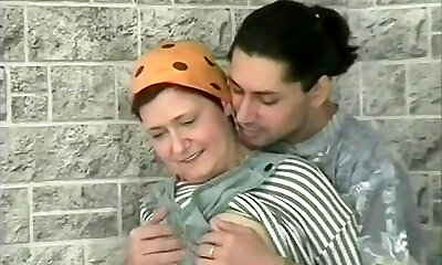 Young boy fucks a muddy old mature maid